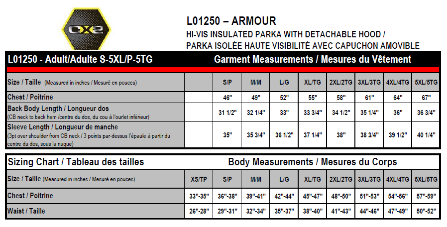 215 gsm – 6.3 oz./yd2 – 10.5 oz./lin. yd 100% polyester oxford 3000 mm waterproof rating, 3000 gsm breathability rating, wind resistant and water repellent finish. Insulation: 220 gsm body, 170 gsm sleeves 100% polyester. Heavy duty polyester canvas with taped waterproof seams & breathable finish. Full body thermal quilted insulation. Detachable thermal lined hood. YKK zipper on front fly with storm flap. Hidden front dome snaps for safety. Oversize patch pockets with flap. Inner zipper pocket. Drawcord on hem for greater mobility & comfort. Adjustable tab closure on cuffs. Brushed tricot pocket lining. Rib knit storm cuff for extra protection. 4” hi-vis contrast band with 2” 3M reflective tape on front and back body and sleeves. Meets CSA standards